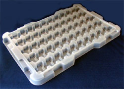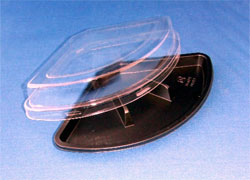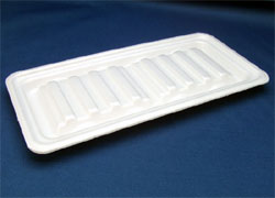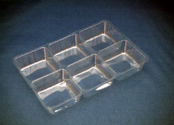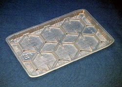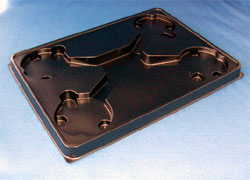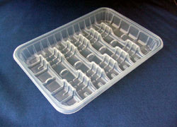 | 食品容器(餃子、珍味、菓子トレイなど) 工業用品用(部品トレイ、ブリスターなど) 三方折り曲げスライドブリスター加工 餃子トレイ等の穴あけ |